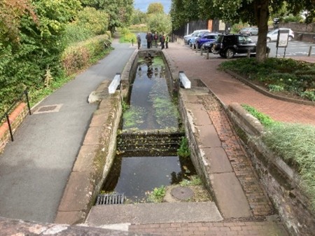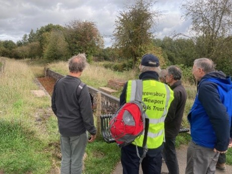 My pre-conceived notion of a derelict Newport Canal was soon dispelled when our guide took us to the “bottom” lock from the long flight down from Norbury Junction. Having fallen into disuse, this structure has been modified, but in a sympathetic way to look like a working lock, albeit reduced in height and closed off by the cross-over footpath.